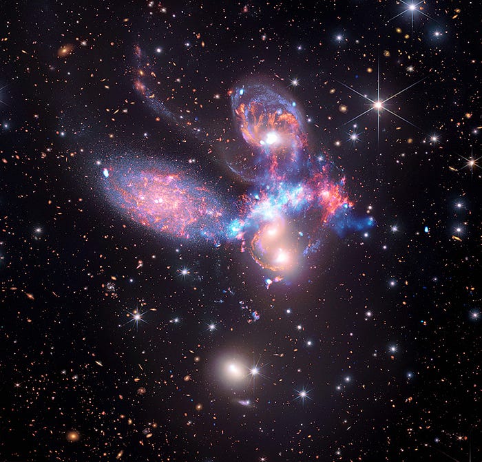Each of the five galaxies of Stephan’s Quintet appears to have something similar to our sun at the center, some seem to have more than one. These images are the clearest glimpse yet into a fascinating galactic neighborhood not far from where we live.